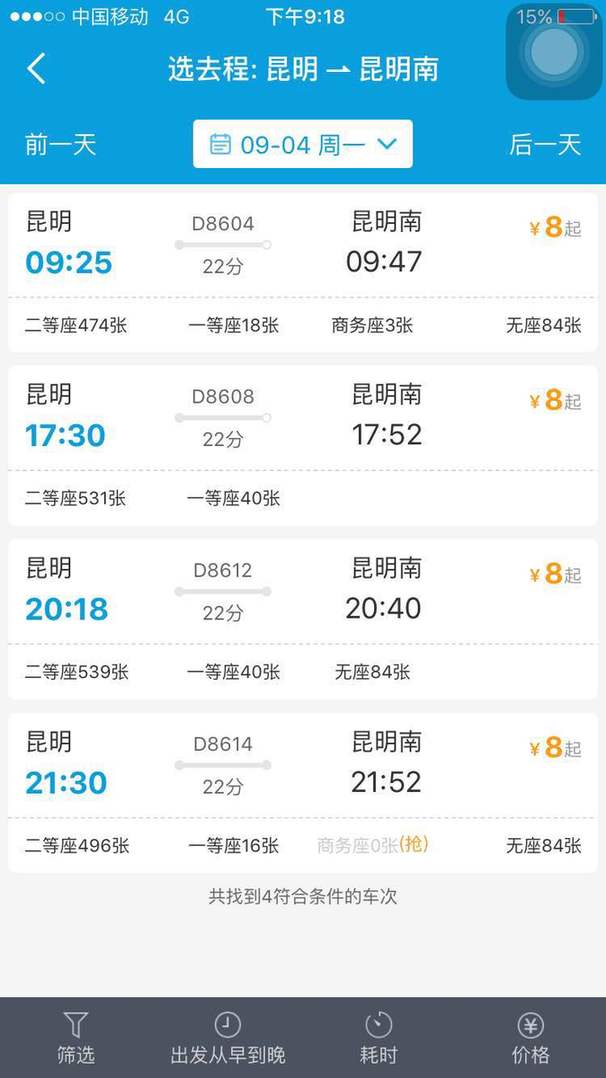 8月30日,中国铁路客服服务中心12306官方网站、携程网、去哪网等平台显示,9月4日已可以查询到当天昆明站前往昆明南站的动车车次和票价,仅需8元钱,耗时22分钟就能从昆明南站到达昆明站,旅客乘高铁动车进出昆明主城区更加便捷。